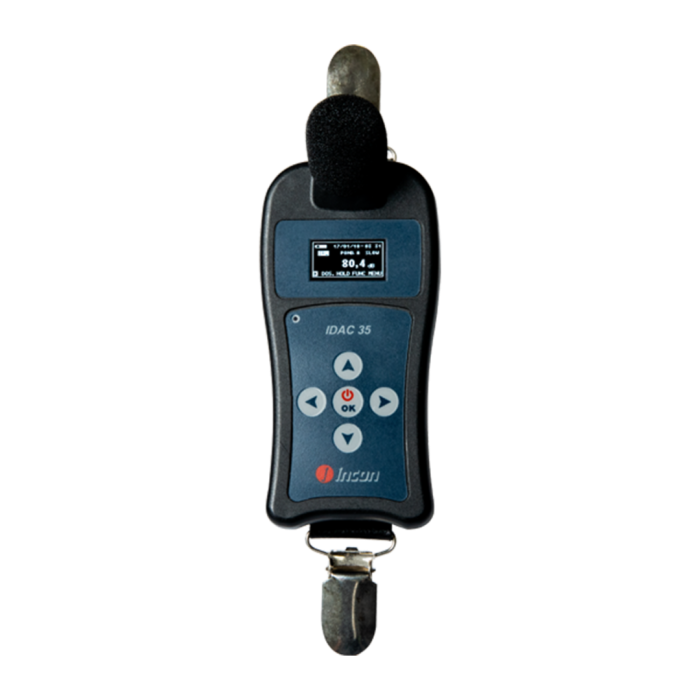 Audiodosímetro IDAC35. Este modelo utiliza microfone destacável p o s s i b i l i t a n d o a c a l i b r a ç ã o e l é tri c a c o n f o r m e a s n o r m a s internacionais.